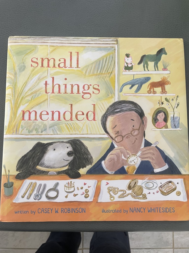 Small Things Mended is one of my new favorite picture books and is the book I’d like to highlight this Valentine’s Day. I recently gave it to one of my granddaughters and I think it’s the kind of book I’d like to give even to adults in my life who give simple, but truly meaningful service to those around them. In our ever-increasingly disconnected world, these people are like the glue that holds communities together, and I love them for it. It has recently received many awards and I can easily see why. It’s such a gentle, sweet, lyrical story, with timeless themes of love, friendship, and the power of community and service. As a bonus, it is full of fun words that make for a great read aloud–words like “jaunty” or “ker-chunk,” and alliteration like “trinkets and treasures.”